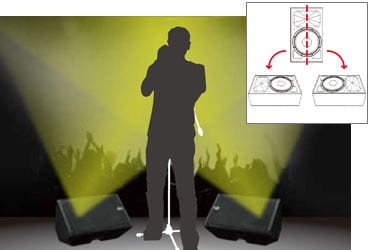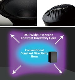 Wide Dispersion Constant Directivity Horn: The larger HF transducer is mounted to an all-new 90° x 60° constant directivity horn, designed with the goal of minimizing radiation pattern deterioration in oblique directions as more conventional horns are prone to doing. This can help to achieve a more ideal coverage area without irregularities. With the new wide dispersion constant directivity horn, sound expands in a more rectangular pattern providing 90° horizontal x 60 ° vertical coverage, with wide-frequency sound projected to the edges of the coverage area.