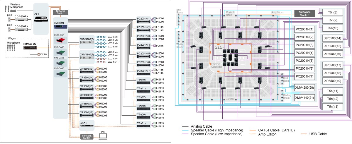 In this system in which audio must be transmitted over long distances, a digital mixing engine, optical cable, and a Dante network are capable of delivering top-quality sound. That reduces the amount of cabling required while preventing signal degradation during transmission.