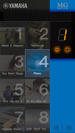 Funkcja odtwarzania audio posiada 9 niezależnych banków z 8 kafelkami, do których można przypisywać maksymalnie 8 utworów lub efektów brzmieniowych z biblioteki iPhone`a/iPad`a. Dzięki temu, każdy użytkownik aplikacji może mieć błyskawiczny dostęp nawet do 72 utworów/efektów brzmieniowych. Wystarczy kliknąć na odpowiedni kafelek z przypisanym plikiem audio. Błyskawiczne odtwarzanie, za pomocą aplikacji MG Rec & Play, daje ogromną elastyczność i znacznie urozmaici każdy występ na żywo. Dzięki aplikacji MG Rec & Play możesz odtwarzać muzykę w tle, wyzwalać ścieżki audio, akompaniament muzyczny, fragmenty utworów lub inne funkcje rozrywkowe, wymagane w danym momencie.