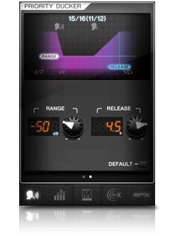 While the Priority Ducker's “Range” parameter settings for Hybrid Channel 1 and 2 can be controlled manually from the MGP console itself, MGP Editor provides additional flexibility, offering intuitive control of “Range” parameters as well as “Release” parameter settings for each Hybrid Channel. [RANEGE] controls Priority Ducker's level attenuator, and [RELEASE] adjusts release time. Both parameters can be controlled using MGP Editor's interface via the graphic display or two knobs underneath. - [DUCKER] button must be activated manually on the MGP console in order to apply parameter settings. - Hybrid Channels are CH 9/10, 11/12 on MGP12X and CH 13/14, 15/16 on MGP16X. - When controlled via the knobs on the MGP console, the same parameter settings are assigned to both Hybrid Channels.
