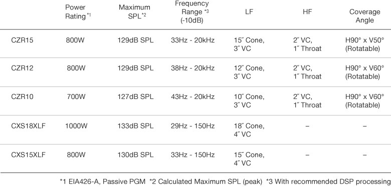 Modele CZR15 i CZR12 osiągają w trybie pasywnym SPL na poziomie 129dB przy mocy 800W, natomiast CZR10 przy 700W. Każdy z nich wyposażony jest w dwie końcówki mocy dla maksymalnej wydajności.