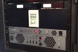 The new system includes 16 Yamaha VXS8 speakers, one Yamaha MTX3 processor, one Yamaha XMV4280 4-channel amplifier, one Yamaha DCP1V-4S wall mount control panel, two Shure BLX4R/SM58 wireless microphones, and Lowell racks and power.