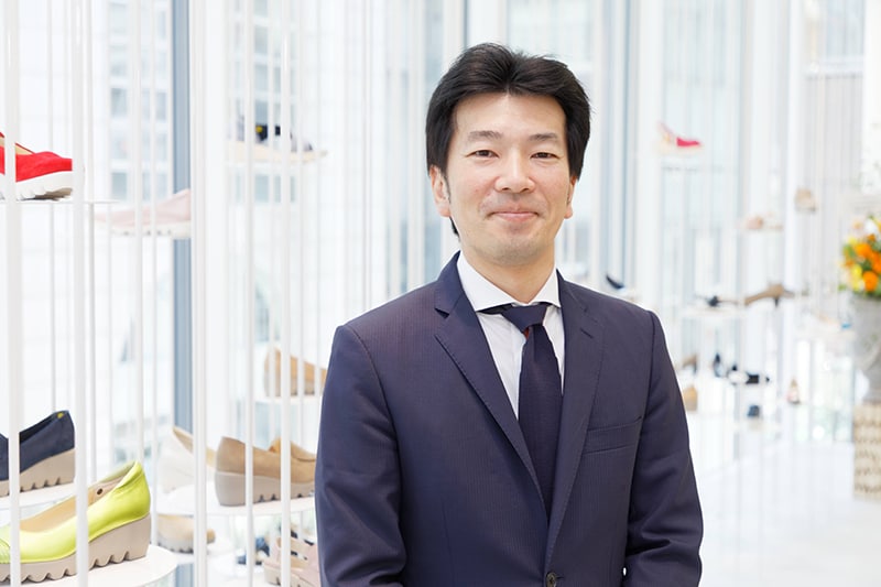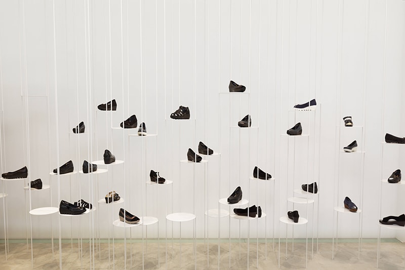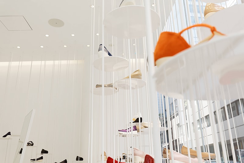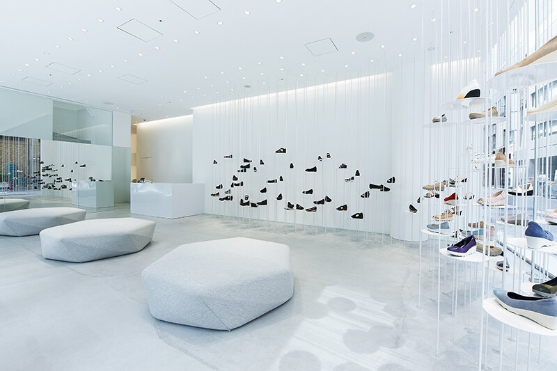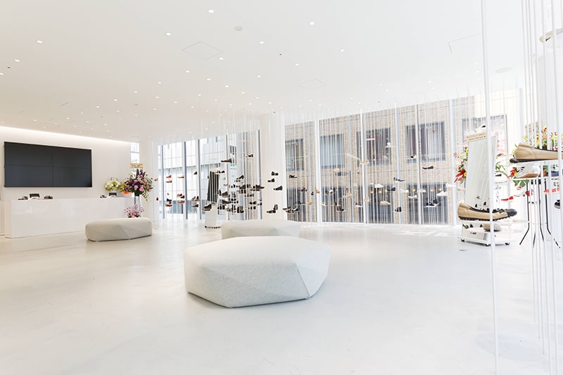 Pan Yoshioka, gdy po raz pierwszy spotkał się z produktami naszej firmy, był pod wrażeniem lekkości wyglądu naszych butów. Chciał w ten sam sposób nadać charakter wystroju wnętrza salonu. Wystrój cechuje lekkość i wzniosłość. Specjalna konstrukcja prezentacji butów sprawia wrażenie, że buty unoszą się w powietrzu, szczególnie patrząc z zewnątrz przez witryny salonu.