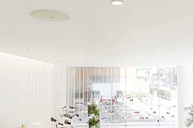 Trzy głośniki VXC5FW są zainstalowane w suficie na pierwszym poziomie salonu, natomiast pięć pozostałych na drugim poziomie. W naszym salonie znajduje się specjalna strefa relaksu, w której klienci mogą odpocząć lub przymierzać oglądane przez siebie produkty. Cały system nagłośnieniowy jest skonfigurowany w taki sposób, aby muzyka docierała do każdego zakątka przestrzeni salonu. Niezależne wzmacniacze MA2030a oraz panele kontrolne są zlokalizowane na obu poziomach na zapleczu dla pracowników. System sterowany jest zdalnie.