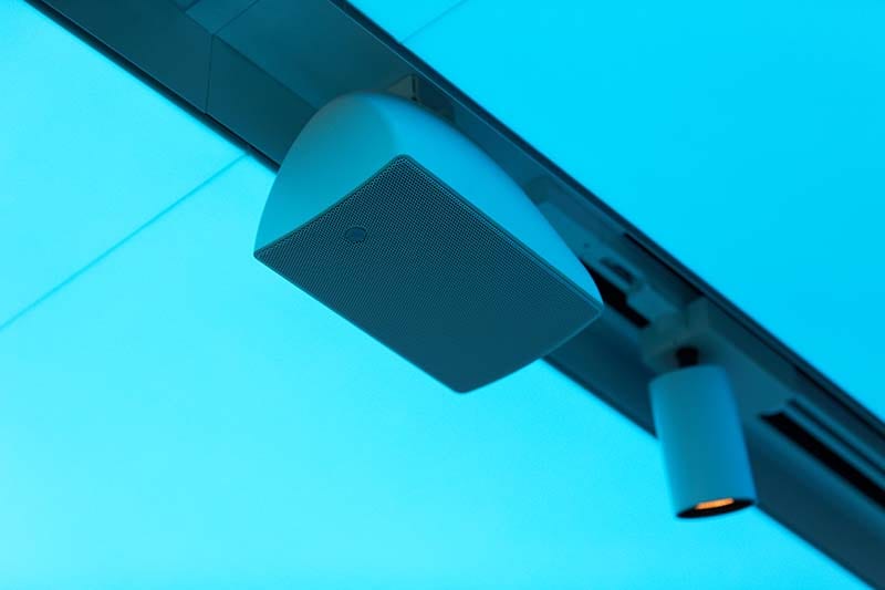 A total of 21 Yamaha VXS5W speakers are installed in the ceiling, assigned to three zones: entrance, a row in front of the video monitor, and the rear area. This allows optimum volume to be set for each zone. The speakers in front of the large monitor deliver sound for video content shown, while the others handle background music. Two VXS10SW subwoofers are also installed in locations that are not visible to guests. Five VXC4W ceiling speakers are installed in the office and restroom.