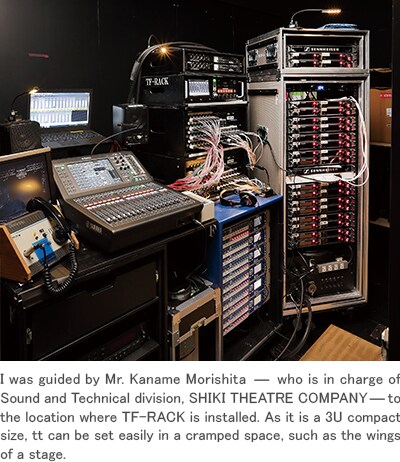 Yamaha’s TF series, digital mixer for PA, have characteristics of compact bodies and intuitive operability with their touch panels. In this episode, we will focus on some examples on introducing rack mount type. TF-RACK is a new model that was released at the end of 2017, which realized further miniaturization from the traditional surface type model. The 3U casing is a compactly equipped with 16 microphones and 16 line in-and line outs, having a maximum mixing capacity of 40 line ins. Moreover, it can be connected with the audio network, Dante by adding an expansion board NY64-D. Since We have heard that it is being used in SHIKI THEATRE COMPANY’s “The Phantom of the Opera”, I have visited the venue KAAT (Kanagawa Arts Theatre) for an interview.