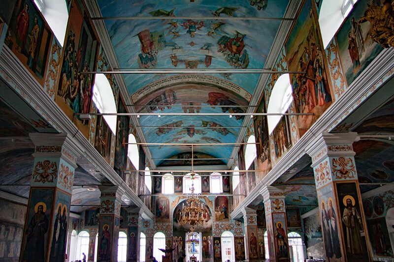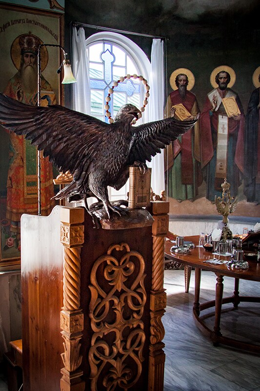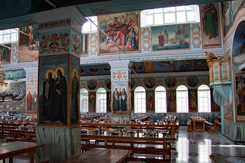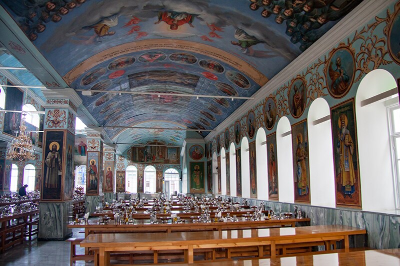 The monastery was originally founded in the 11th Century, with much of the present complex built on a nearby site, closer to the sea, between 1812 and 1821. Today it is the largest monastery on the Mount Athos peninsula, its multi-storied buildings and tall cupolas giving the impression of a city in miniature. Its Cenobitic tradition follows the monastic practise of regulated community life. A key part of this is mealtimes where, after prayers in church, monks and pilgrims gather in the refectory to eat, while being read scripture from the Bible.