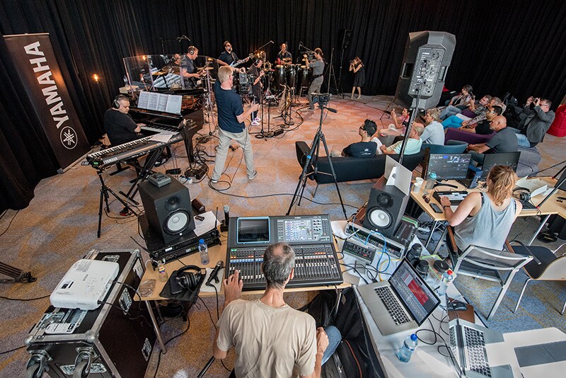 Lex mixed the session on a Yamaha QL5 digital console, which he particularly likes thanks to its great-sounding reverbs. He also used a Rio3224-D2 i/o unit as a preamp for the multitrack recording to Steinberg Nuendo Live. Lex routed a stereo mix to a pair of Yamaha DXR12 speakers, which provided sound reinforcement for the exclusive audience, plus a pair of Yamaha HS8s as his monitors. Artists monitoring was via eight pairs of HPH-MT7 headphones.