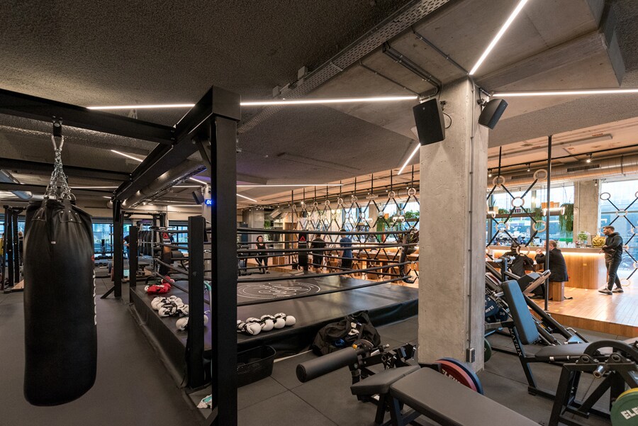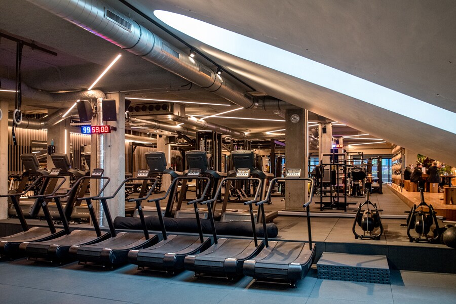 Główna przestrzeń siłowni jest uzupełniona wyeksponowaną strefą gastronomiczną, salą spotkań oraz pomieszczeniami do pilatesu i jogi.