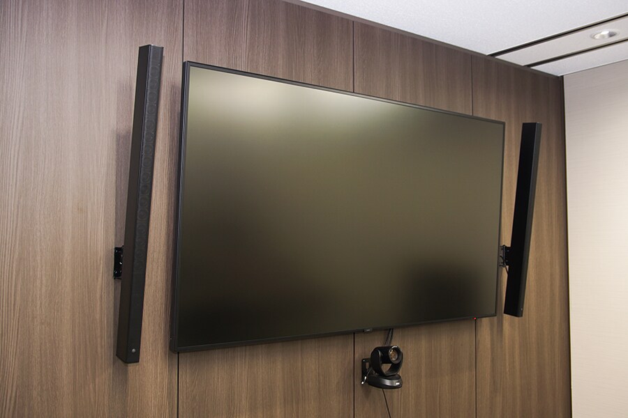• Dante/PoE-compatible Line Array Speaker VXL1W-16P Installed Left and Right of a Wall-mounted Screen