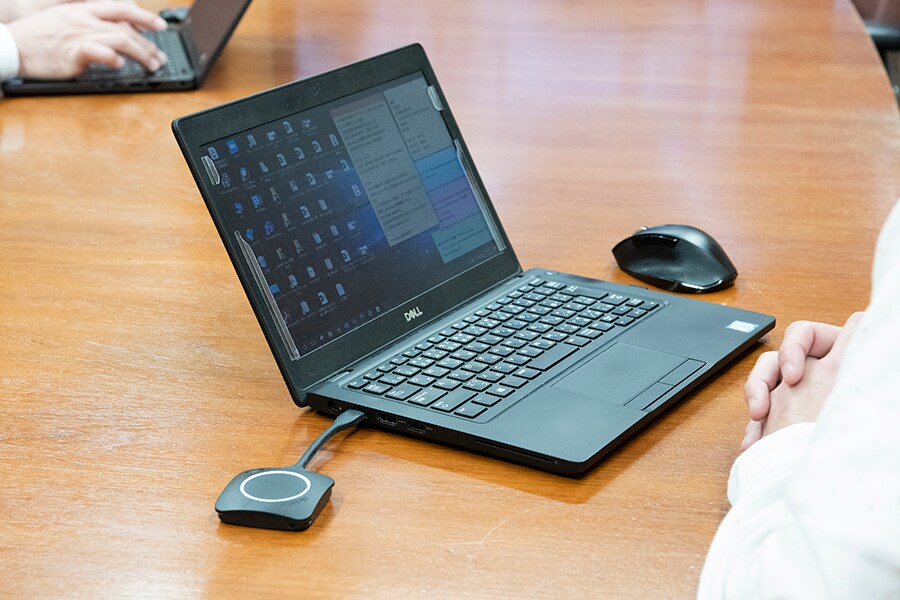 However, with ClickShare, you can simply connect the cable to the ClickShare Base Unit, and then simply insert the ClickShare button into your computer, so that you can have remote teleconferences using ADECIA immediately. In the first place, ADECIA's ceiling microphone offers the advantage of maintaining a tidy-looking table, so by combining it with ClickShare, you can create a completely wireless remote teleconferencing environment where there are no cables on the table at all.
