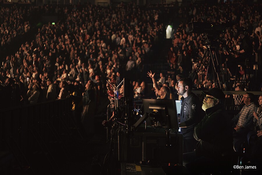 David Loy, FOH mixing on PM3 surrounded by crowd