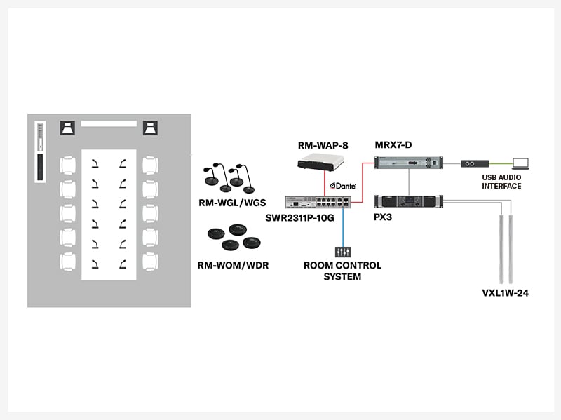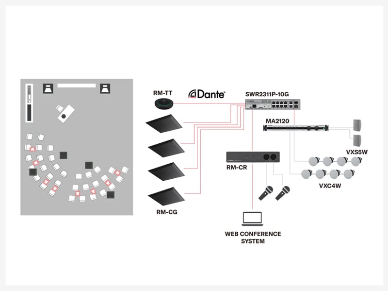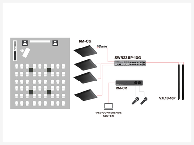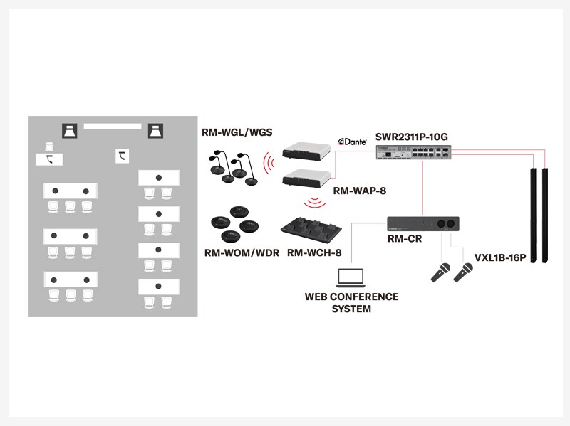 Its RM-CR conference processor offers two additional analogue microphone inputs. VXL1-16P speakers provide perfect audio output.