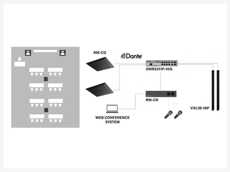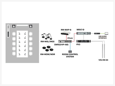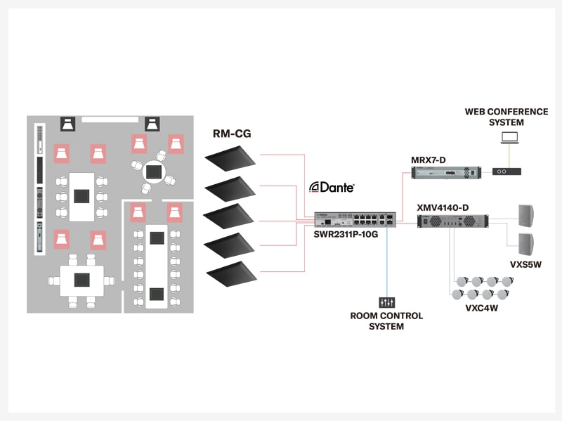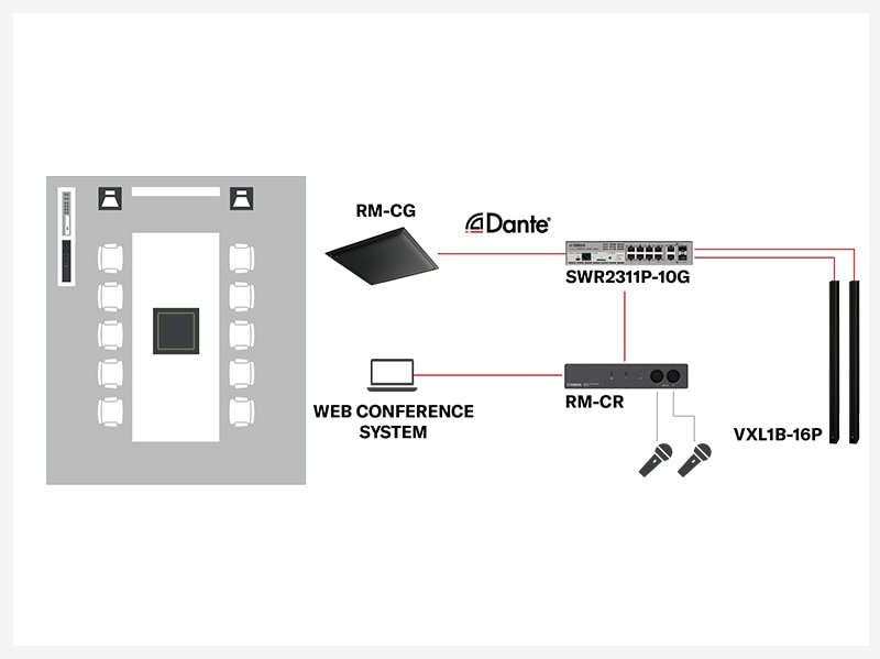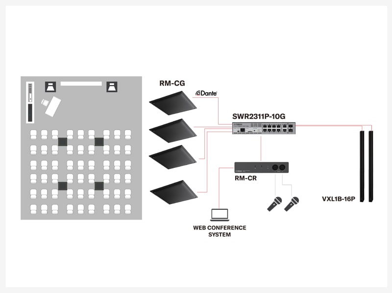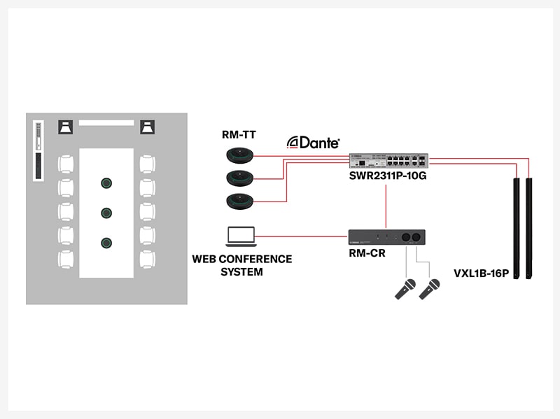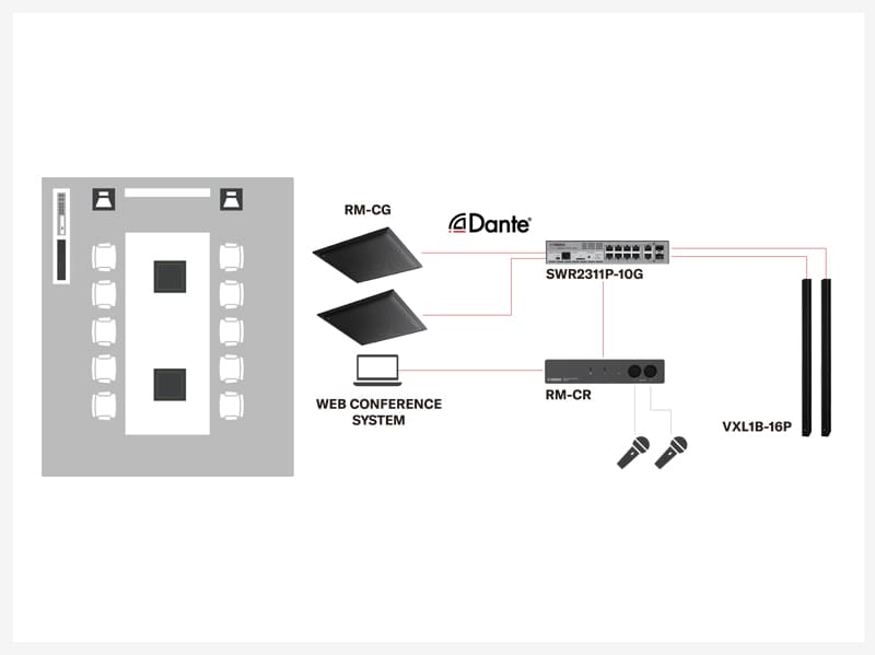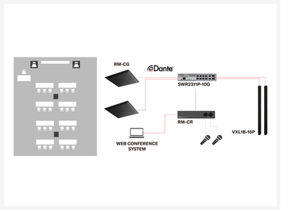VXL1-16P Dante Speakers deliver clear sound reproduction. The system easily integrates with UC platforms. The RM-CR conference processor takes care of all the audio routing automatically.