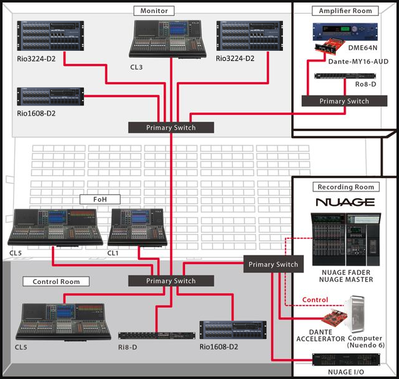 The standard Dante network uses a gigabit network switch in a star configuration. Network connections can be doubled for redundant operation so that the system remains operational even if a fault occurs in a network cable or device. If live recording is a requirement it’s easy to add Dante Virtual Soundcard and Steinberg Nuendo Live running on multiple computers. And if R series I/O racks are used with CL series consoles the Gain Compensation function makes it possible for multiple CL consoles to share Rio racks.