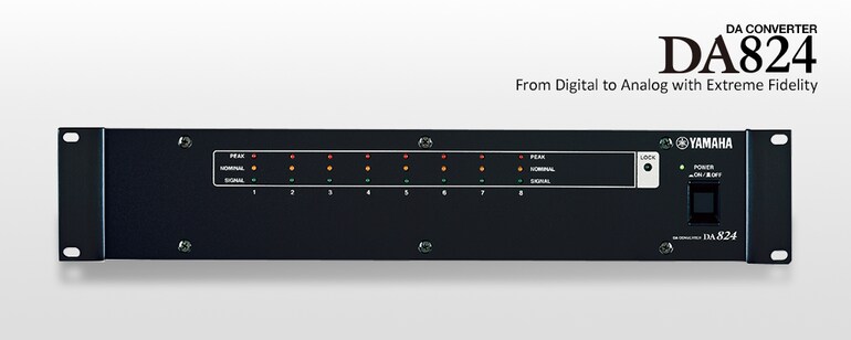 The DA824 can operate in conjunction with other digital audio equipment or as a stand-alone converter. A Mini-YGDAI card slot allows it to connect to digital mixing engines, digital mixing consoles, or digital MTRs, providing a high quality back end for analog audio output. High quality 24-bit D/A. Balanced XLR and 1/4" output connectors. Maximum +4, +15, +18, or +24 dBm output level individually selectable for each channel. Mini-YGDAI card slot (ADAT, TASCAM, AES/EBU). Word clock input and thru connectors. Signal, nominal, and peak LED indicators.
