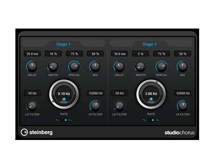 StudioChorus is a two-stage chorus effect that adds short delays to the signal and modulates the pitch of the delayed signals to produce a doubling effect. The two separate stages of chorus modulation are independent and are processed serially (cascaded).