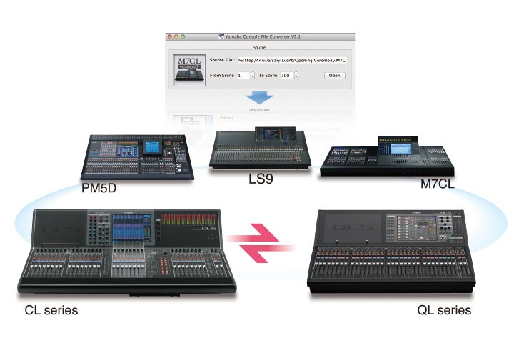 Serie konsol mikserskich QL oraz CL są w pełni kompatybilne. Dane utworzone w mikserze z jednej serii może być wczytywane i stosowane przez drugą. Dzięki temu, czas spędzony na konfiguracji danych miksu może zostać poświęcony do wykonywania innych funkcji. Ponadto, aplikacja Yamaha Console File Converter gwarantuje kompatybilność z modelami PM5D, M7CL oraz LS9. Możesz korzystać z dawnych ustawień nawet w przyszłości.