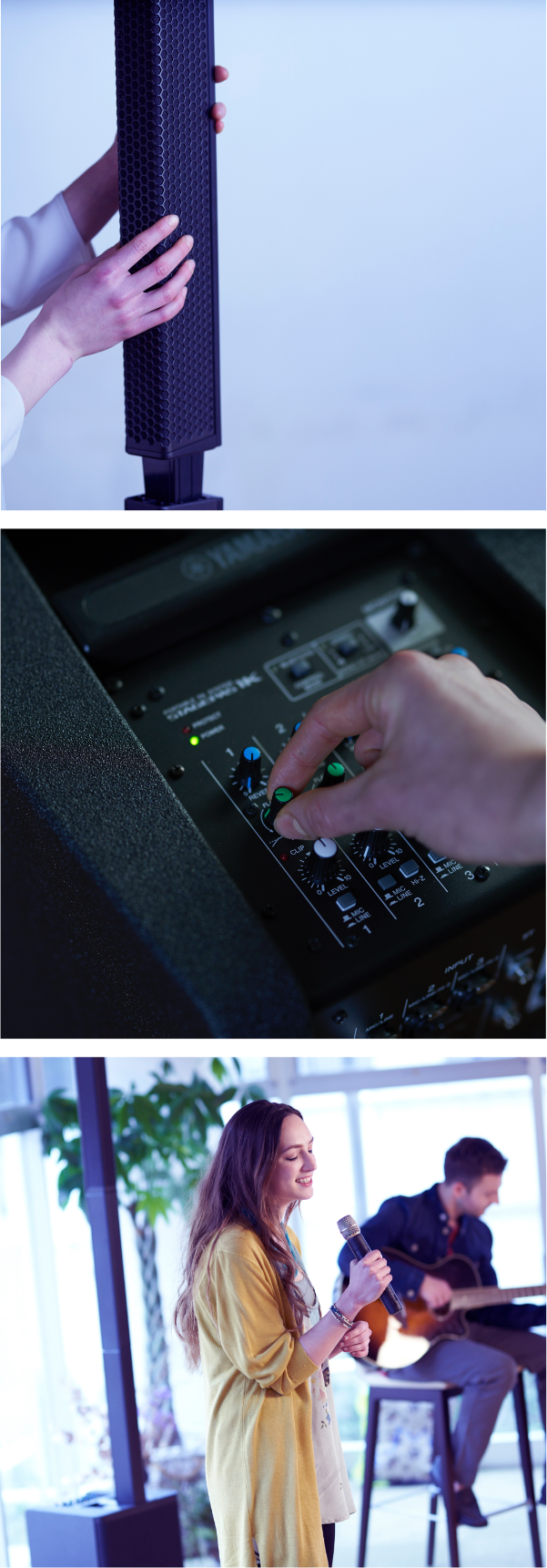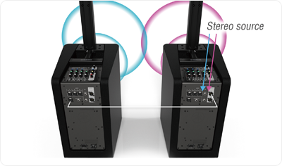 Linking two STAGEPAS 1K’s provides wider coverage area and higher output power for larger scale performances. Both stereo and mono playback are supported, and when set to mono, both STAGEAPAS 1K inputs can still be used (up to 6 mono inputs plus 2 stereo inputs).