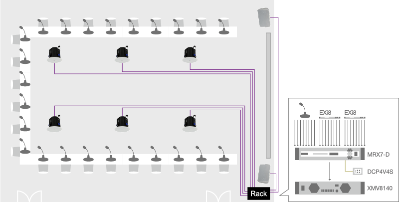 The MTX-MRX Editor software facilitates sound system design with a workflow that simulates standard installation procedure. An easy-to-use wizard lets you start by arranging the devices to be used in the desired layout, then processing components can be added wherever needed. MTX series matrix processors, EXi8 input expanders, EXo8 output expanders, XMV series power amplifiers, and DCP digital control panels can be added according to the needs and scale of the application. The MTX-MRX Editor provides comprehensive, intuitive tools for designing sound systems from input to output.