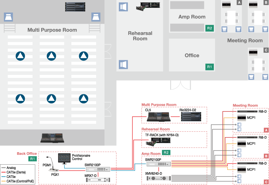 - Aggregate in-house broadcasting and voice control of each area into MRX7-D system, and manage them all with Provisionaire Control.