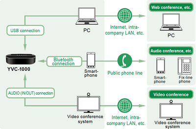 Connect to the YVC-1000 via USB, Bluetooth*1, or the audio terminals*2 of a conferencing system for high quality audio in your conferences and meetings. This range of connection options allows you to quickly adapt to a variety of communications environments, as well as situations where conferencing might otherwise be difficult due to the lack of a landline, or internet connectivity issues.