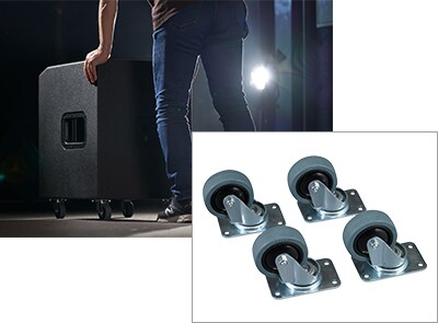 Dostępne są opcjonalne kółka do subwooferów DXS ułatwiające transport. Są to wytrzymałe elementy, które poza oczywistą funkcją, gwarantują stabilność na scenie podczas występu.