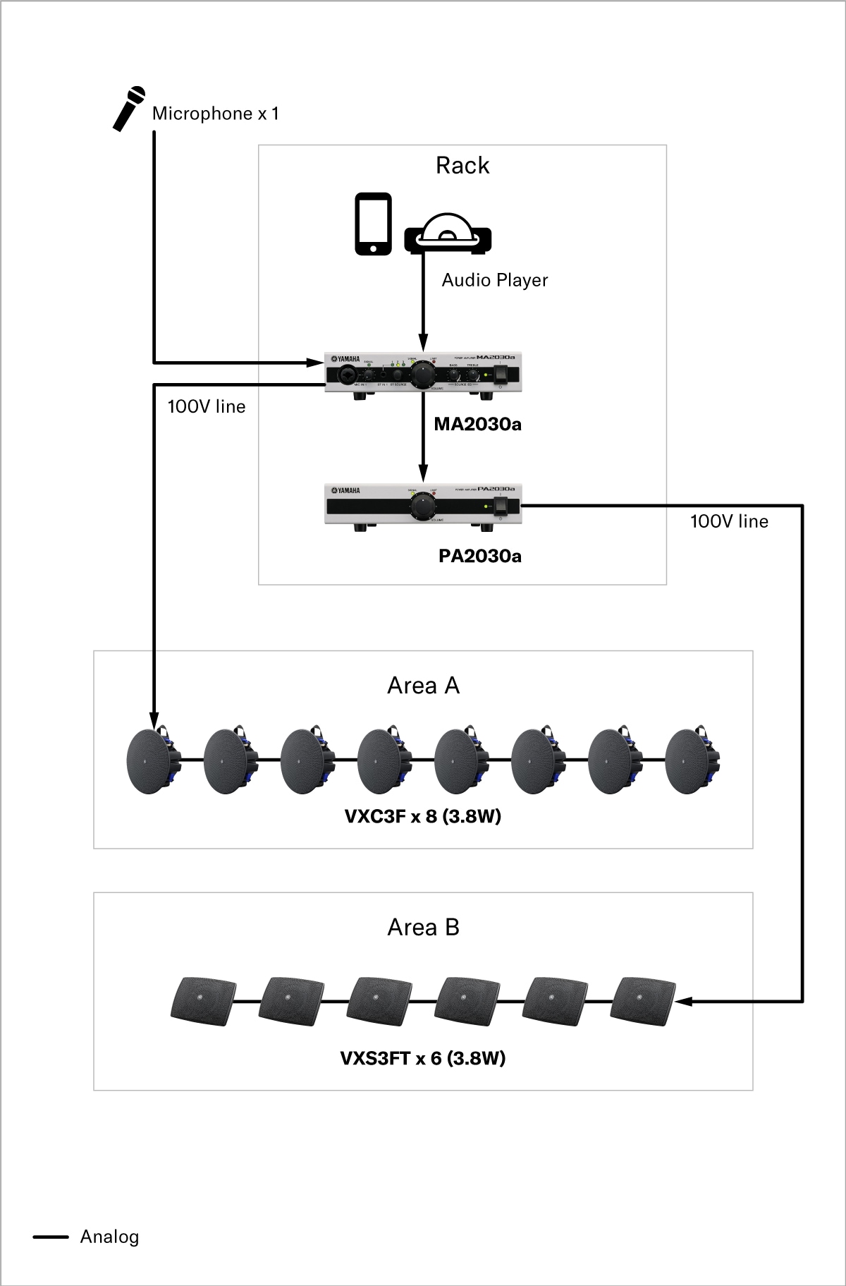 If the area is large, more speakers can be connected by adding a PA2030a amplifier for expansion from the same series. The volume controls of the two amplifiers can be interlocked, so the overall volume level can be controlled with a single operation.
