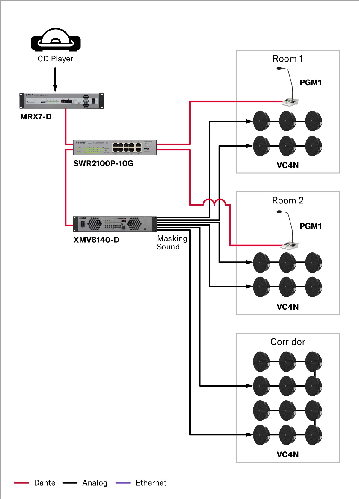 The MRX7-D signal processor plays masking audio from the speech privacy system. The VC4N ceiling speaker is used for background music playback as well as masking audio playback. The VC4N is a compact, low-profile speaker that delivers natural sound characteristics suitable for music playback.