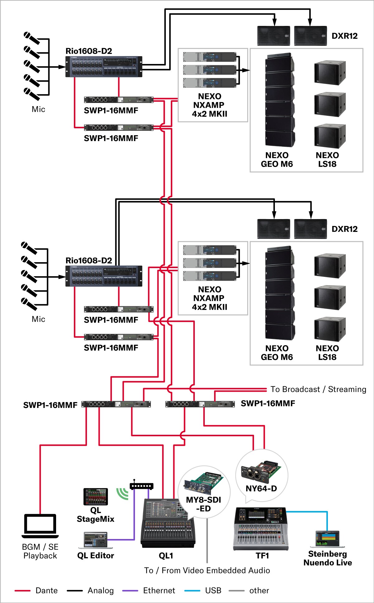 NEXO’s GEO M6 compact line array speakers feature a highly flexible design that allows them to deliver their clear, powerful sound without obstructing the view of screens or displays. A Yamaha DXR12 powered loudspeaker serves as the stage monitor, minimizing setup and space requirements with its versatile enclosure design and significant power output. QL series consoles handle the mixing duties for this setup, equipped with Dugan Automixer which automatically sets the ideal volume for multiple microphones— an essential function for event PA. TF series consoles equipped with a Dante card can also be used to create mixes for streaming with no loss of sound quality.