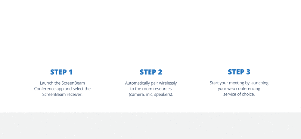 ScreenBeam Conference software is included free with every ScreenBeam 1100 Plus receiver. ScreenBeam Conference wirelessly connects the room USB peripherals (camera, microphone and soundbar) to the host device. Users can drive a meeting from their own device and UC (Unified Communication) conferencing service of choice and take full advantage of the room peripherals. ScreenBeam Conference eliminates contact with shared touchpoints for a safer meeting experience.