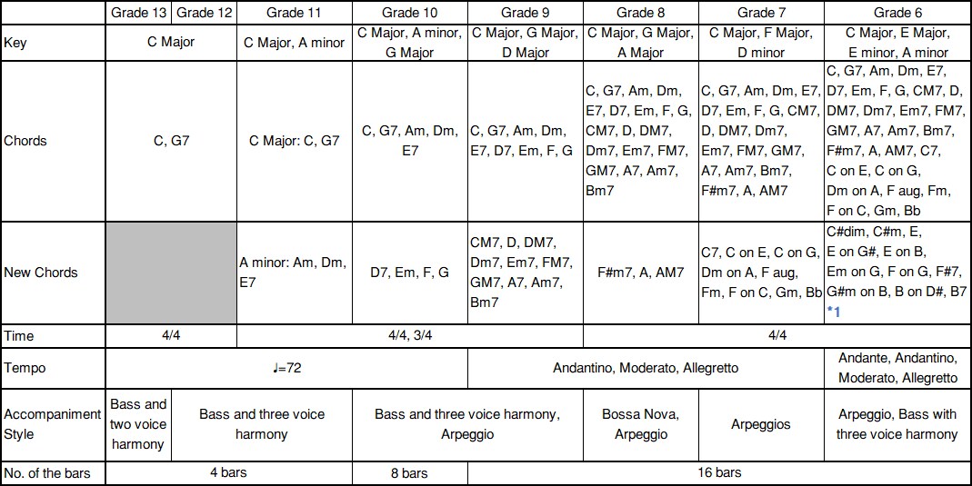 Grades 7, 6: The accompaniment pattern will not be provided, and the candidate will be expected to play an appropriate accompaniment pattern.