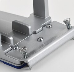 The hinge base and cover (blue parts) are independently smoothed and precisely fabricated before assembly, allowing smooth foot board performance.