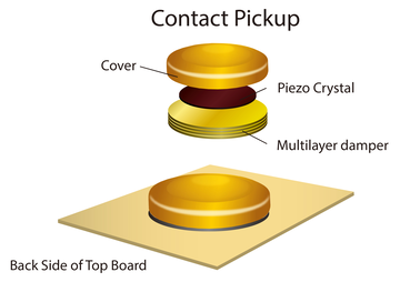 Konwencjonalny przetwornik kontaktowy montowany pod siodełkiem wibruje swobodnie, co pozwala mu na zbieranie naturalnego brzmienia korpusu. Istnieje jednak ryzyko sprzężeń, przy zbyt wysokich natężeniach odbieranych sygnałów.