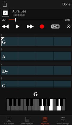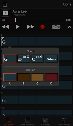 Graj wyświetlane akordy utworów, które są przechowywane w pamięci Twojego urządzenia. Chord Tracker prezentuje aktualne akordy do zagrania. Możesz ćwiczyć partię melodyczną prawej ręki i akordy swoją lewą lub akordy prawą, zaś bas lewą ręką. Dodatkowo, dzięki odpowiedniej funkcji możesz wyciszyć lub zminimalizować poziom głośności melodii w utworze i grać tylko tę partię.
