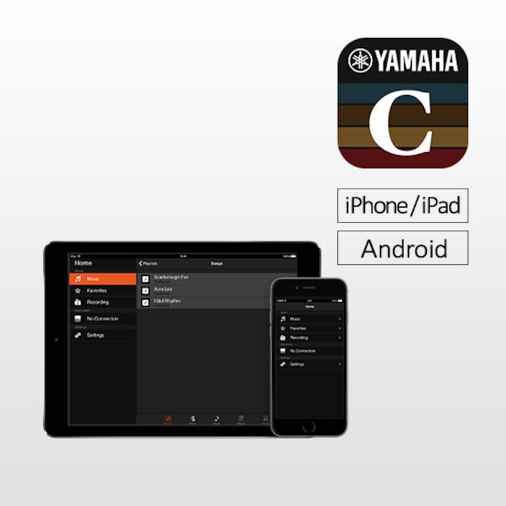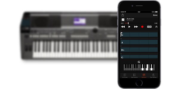 Podłącz swoje urządzenie iOS do instrumentu, aby przesyłać odtwarzane utwory i użyć wbudowanych głośników w instrumencie. Aplikacja Chord Tracker wysyła także informacje o akordach. Możesz nagrywać swoje wykonania na instrumencie w pamięci urządzenia iOS w postaci pliku audio i dzielić się nimi z innymi, za pomocą maila (format plików AAC lub WAV).
