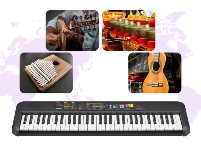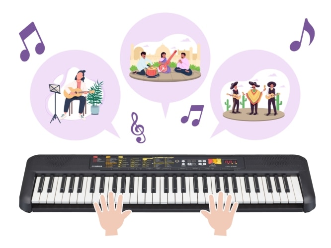 Nie tylko pianina, gitary czy instrumenty dęte - Yamaha PSR-F52 została wyposażona w brzmienia instrumentów (Voices), które są niezbędne do wykonywania muzyki z wielu różnych regionów. Funkcja automatycznego akompaniamentu (Style) dostarcza radości z grania z wirtualnym zespołem i zawiera różnorodne style, nie tylko standardowe gatunki, takie jak rock czy jazz, ale również te, które oddają esencję muzyki uwielbianej w wielu różnych krajach.