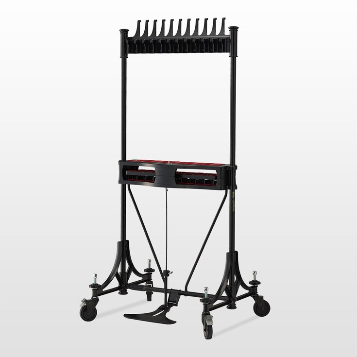 A swivel prevention function has been added to the caster locks. Furthermore, the YCH7018 now features height-adjustable casters. If the chime tubes are not properly centered in the damper they can touch the damper felt, reducing sustain and deadening the tone. Adjustable-height casters make it easy to level the instrument so that the chime tubes hang away from the damper felt.