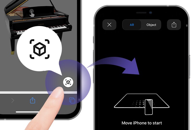 [♪] Dotknij modelu 3D, aby Piano AR odtwarzał dźwięk, a następnie dotknij go ponownie, aby zatrzymać odtwarzanie. Podczas korzystania z tej funkcji należy zwracać uwagę na otoczenie. Dźwięk może nie być słyszalny jeśli telefon jest w trybie cichym, lub jeśli zmniejszono głośność.