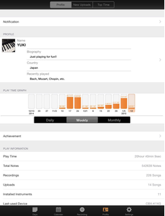 Część „pamiętnika” naszej aplikacji Piano Diary zapisuje informacje o tym jak długo i jak często, a nawet jakie nuty ćwiczyłeś. Możesz porównywać swoje dokonania z innymi użytkownikami Piano Diary. Nasza aplikacja motywuje do ćwiczeń poprzez odblokowywanie nowych brzmień wraz z częstymi ćwiczeniami.