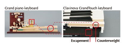 Counterweights are embedded in the keys of a grand piano to balance the weight of the hammers and offer more precise control when playing delicately at low volumes. The Clavinova features carefully adjusted counterweights for improved playability when playing pianissimo with a light touch, and better key return in rapid passages. The keyboard of the Clavinova has been fine-tuned to offer optimal balance, emphasizing its superb playability and grand piano response.