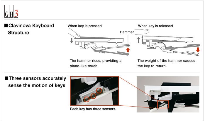 Dynamika klawiatur Clavinova jest doceniana przez pianistów za swoją niesamowitą wierność oryginalnej klawiaturze fortepianu. Jej sekretem jest wykorzystanie tego samego, bez sprężynowego systemu młoteczków, które znaleźć można w akustycznym instrumencie. W zależności od wagi młoteczka, siły twojego dotyku oraz naturalnemu powrotowi klawisza po zwolnieniu, Clavinova wiernie odtwarza dynamikę akustycznego pianina z ciężkimi klawiszami niskich tonów oraz lżejszymi dla tonów wysokich. Ważny jest także, trzy sensorowy system Yamaha, który dokładnie interpretuje zachowanie klawiatury, dokładnie tak samo jak w fortepianie koncertowym.